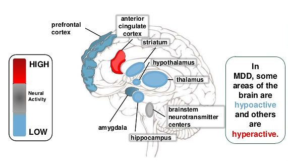 For people with depression, many areas of the brain are underactive: it is difficult to stay awake or present (thalamus), escape negative emotions (amygdala and hypothalamus), and cope with anger or pain of any kind, whether physical, emotional, or mental (anterior cingulate cortex). Since the prefrontal cortex is the main executor in our personality, self-discipline, and concentration, a person with depression may feel helpless. Increasing the excitatory neurotransmitters serotonin (involved in mood) and norepinephrine (crucial for alertness) can help these individuals regain their sense of self.
