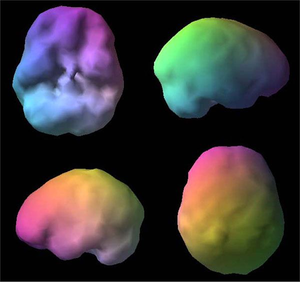 Healthy SPECT image of the brain: Smooth surfaces with soft indentation that indicates separate regions of the brain.